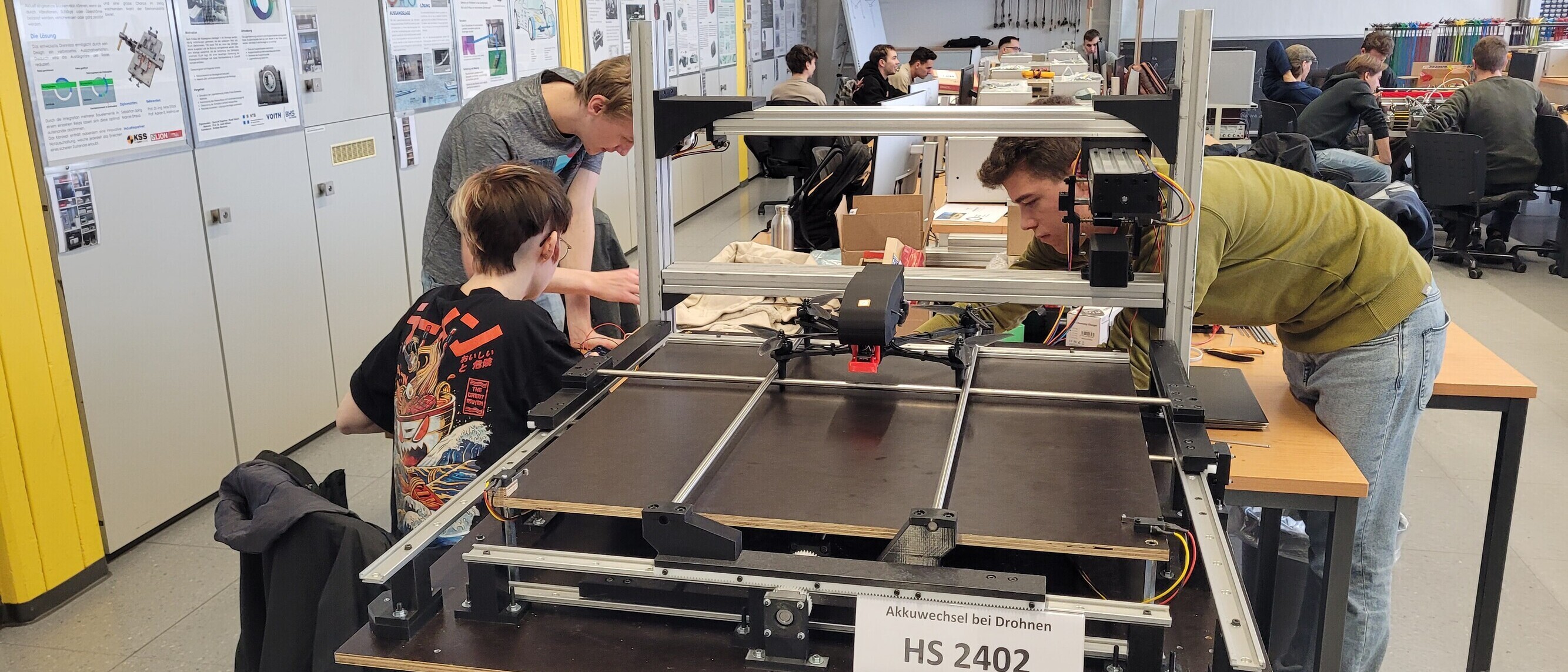 Im dritten Semester stand der Aufbau eines funktionsfähigen Prototyps unseres automatisierten Akkuwechsel-Systems im Mittelpunkt. Wir haben die komplette Brückenkonstruktion gefertigt, den Greifer aufgebaut und mit Sensorik sowie der notwendigen Elektronik ausgestattet. Der Fokus vom Semester war damit der Zusammenbau unseres Docks um danach den Prozess zu Testen.