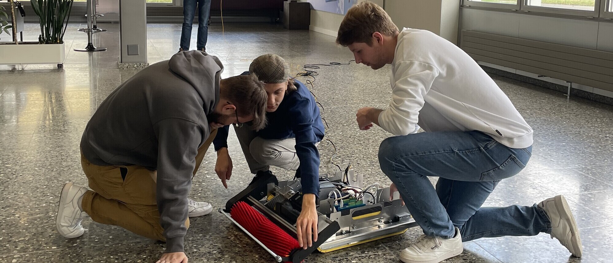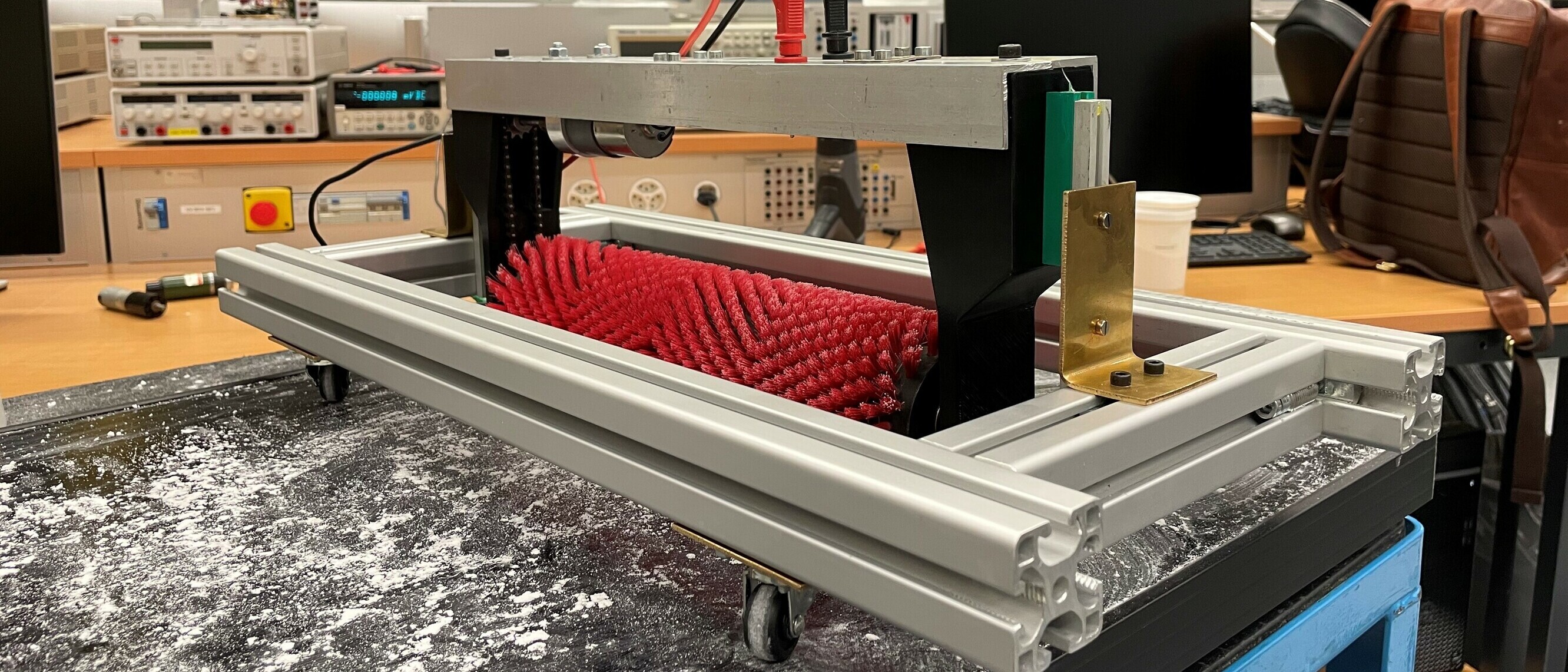 Gegen Ende des dritten Semesters ist es uns gelungen, die Teilsysteme für den Raupenantrieb und den Bürstenantrieb erfolgreich zu kombinieren und somit erste Reinigungstests mit externer Wasserversorgung auf einem Solarmodul durchzuführen.